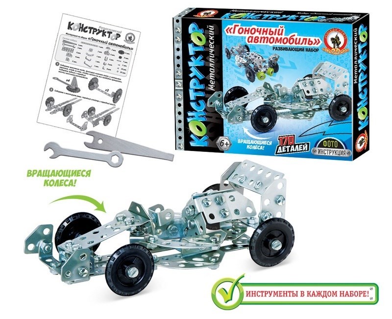 Металлический конструктор "Гоночный автомобиль" от "Русский стиль" состоит из 170 деталей. Из них мальчику предлагается собрать различные модели гоночных автомобилей. Полученным игрушками ребенок сможет играть, потому что у машинок подвижны колеса. Следуя приложенной схеме-инструкции, применив смекалку и терпение, ребенок увлекательно и полезно проведет время, развивая фантазию, глазомер и пространственное мышление. Особенности: - Конструктор представлен разноцветными металлическими деталями разной геометрической формы, крепежом и инструментами. - Детали имеют сквозные отверстия для крепежа и легко соединяются друг с другом