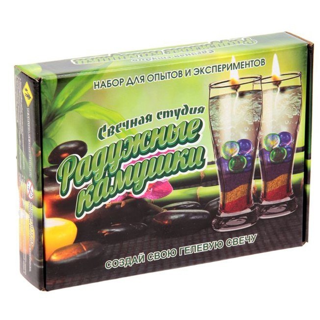 «Радужные камушки» — набор для создания гелевых свечей, включающий в себя не только весь необходимый для работы инструментарий, но и материалы. Используемый в нем гель, а также все прочие компоненты совершенно безвредны. Попробовать свои силы в изготовлении авторских свечей может и 10-летний ребенок. Получившиеся изделия украсят любую комнату в доме, а, кроме того, их можно будет подарить друзьям или родственникам.