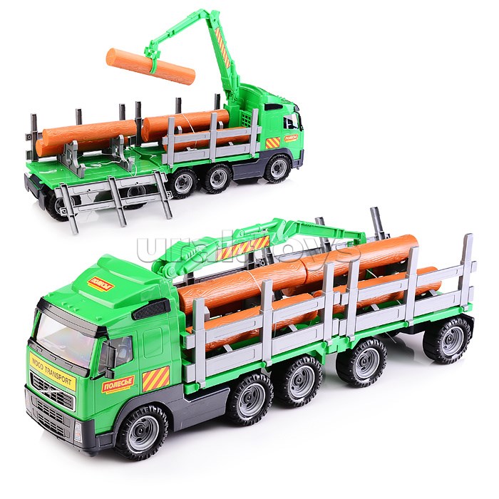 • Замечательный подарочный вариант лесовоза. Ребёнку будет интересно разгружать и загружать брёвна манипулятором.