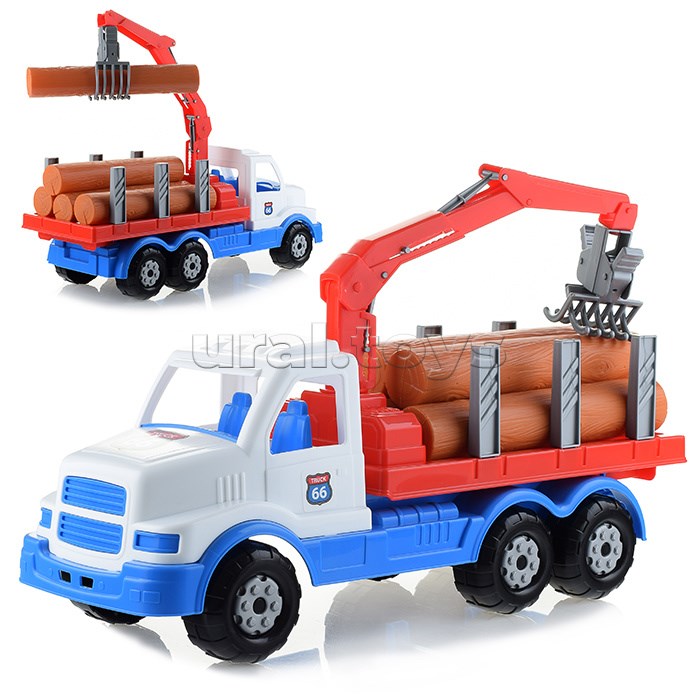 Лесовоз "Сталкер" оборудован поворотно-зажимным краном для погрузки и разгрузки бревен (в комплекте 5 брёвен). С этой игрушкой можно играть как дома, так и на свежем воздухе.