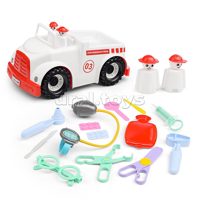 • В комплекте: грелка, 2 таблетки, скальпель, термометр, тонометр, ножницы, щипцы, шприц, молоток, ларингоскоп, очки, лопатка окулиста.