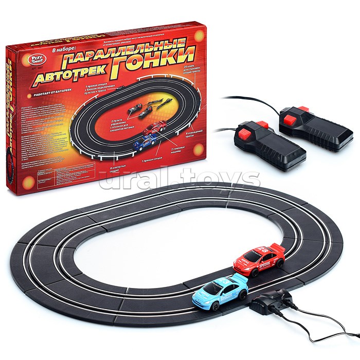 В наборе: 2 гоночные машины, 2 пульта управления, 1 прямая секция, 8 изогнутых секций, 1 прямая секция с блоком подключения пультов к трассе, 8 ограждений трассы, 20 клипс для стыковки секций трассы.