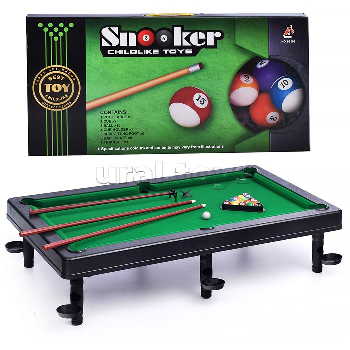 В наборе: бильярдный стол, три кия с подставками для удобного удара, 16 шаров, треугольник для установки шаров на столе.