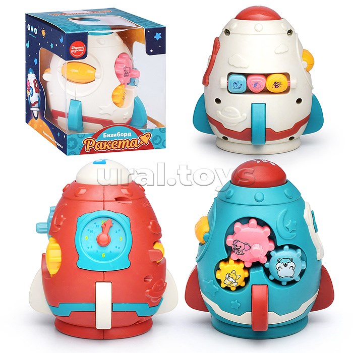 • Функции: кнопка-пищалка, вращающиеся шестерёнки, циферблат с подвижной стрелкой, ролик с английскими буквами, крутящиеся кубики.