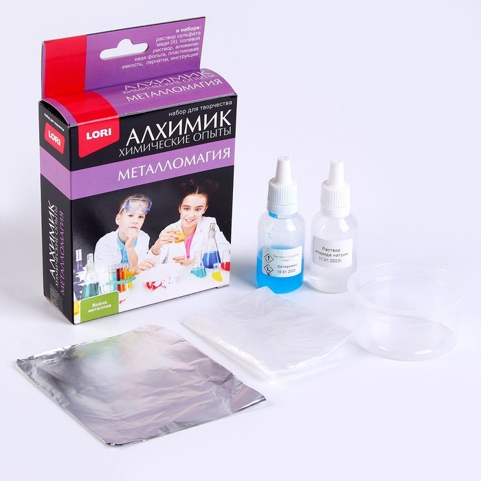 Комплектация: раствор сульфата меди (II), солевой раствор, алюминиевая фольга, пластиковая ёмкость, перчатки,инструкция.