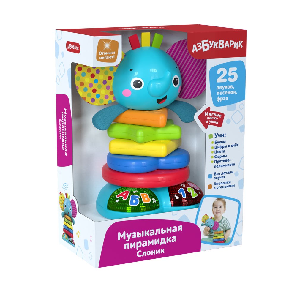 Необычная развивающая игрушка для малышей! Собирая пирамидку в виде забавного слоника и надевая фигурки друг на дружку, ребенок будет слушать забавные звуки, веселые песенки и мелодию. Все детали – разного цвета и формы, игра с ними развивает логическое мышление и мелкую моторику. Познавательные песенки на кнопочках с огоньками помогут выучить буквы и цифры, цвета, формы и противоположности. А еще этот слоник – очень милый, у него мягкие лапки и ушки, которые шуршат. Батарейки: 3AAA (в комплекте демонстрационные)