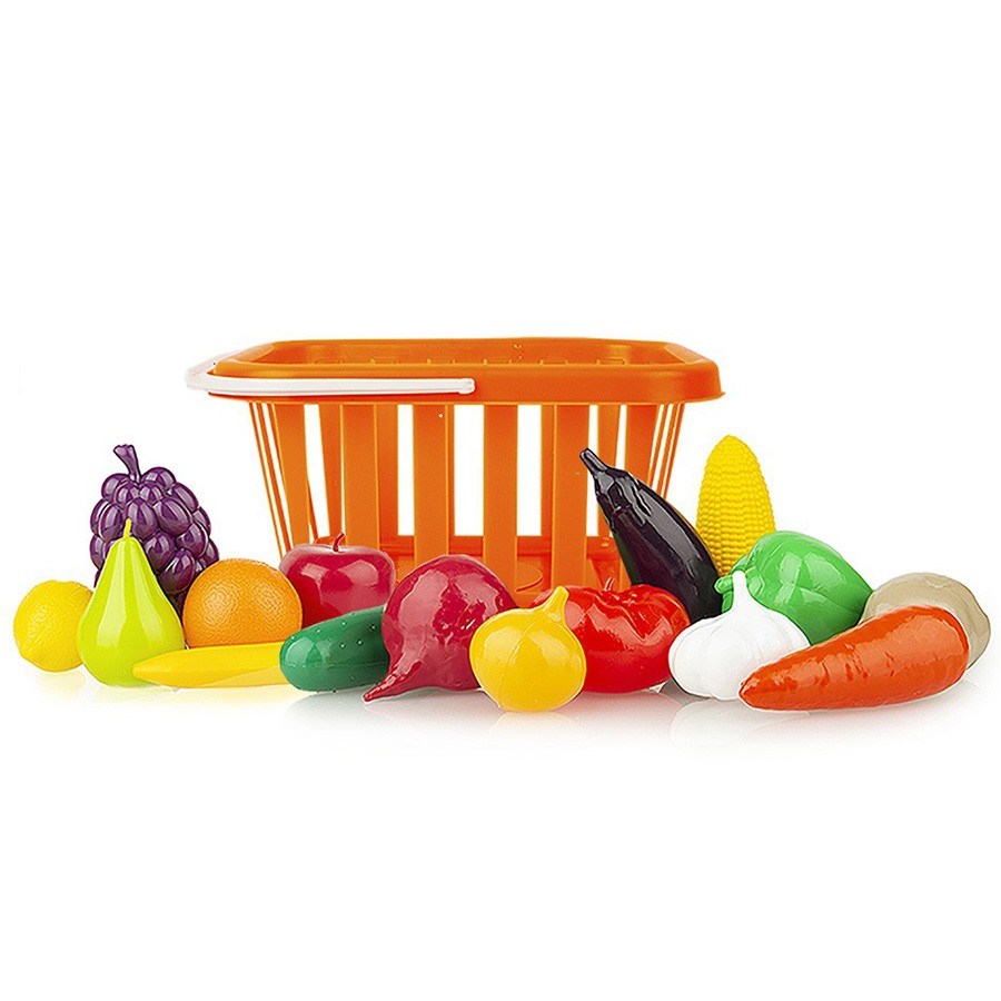В корзине (виноград,лимон, апельсин, банан, груша, яблоко, огурец, перец, морковь, свекла, кукуруза, картофель, баклажан, помидор, лук)