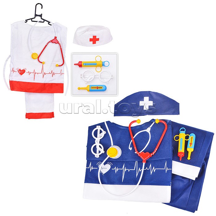 • В наборе: штаны на резинке, накидка на завяхках, колпак (р-р 50-52), очки, стетоскоп, шприц, градусник.
