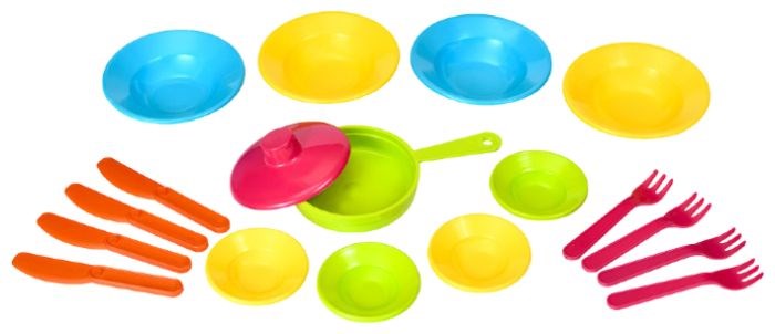 Комплектация: 12 предметов (4 суповые тарелки, 4 маленькие тарелки, 4 вилки, 4 ножа, сковорода, крышка. Для игр, имитирующих повседневные домашние дела, есть множество различных приборов и аксессуаров, которые позволят оборудовать игровой домик и организовать его пространство по образу и подобию взрослого. Такие игры приучают девочек к ведению домашнего хозяйства, готовят ко взрослой жизни. Набор для обеда привлекает внимание не только своим ярким внешним видом, но и функциональностью. С ним малышка почувствует себя настоящей хозяйкой и сможет приготовить куклам угощение.