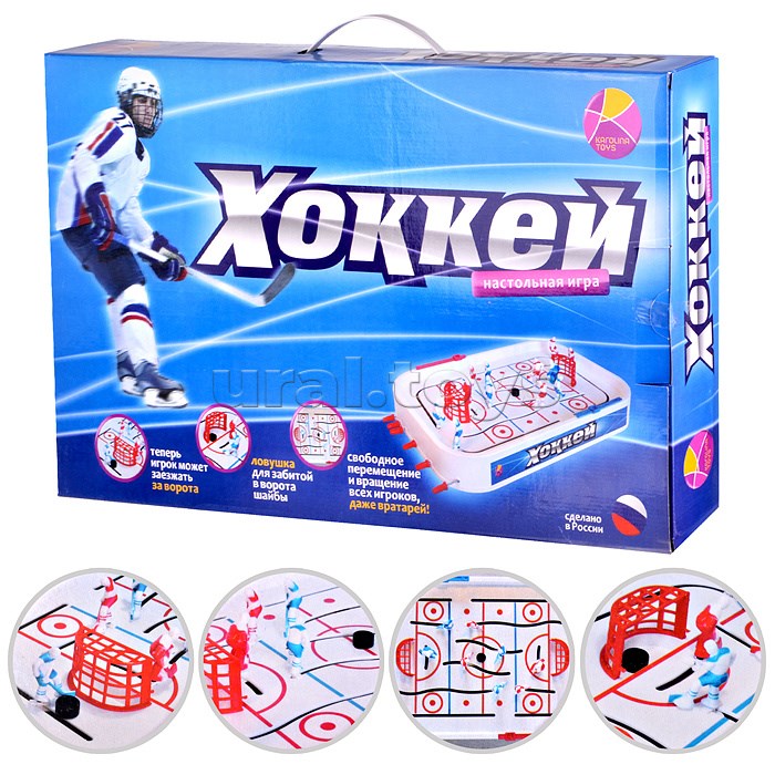 При помощи этой настольной игры можно устроить увлекательный хоккейный матч прямо на столе у себя дома. В набор входит большое игровое поле с ручками для управления хоккеистами и две команды фигурок по десять игроков и одному вратарю в каждой. Задача каждого участника — забить как можно больше голов в ворота соперника. В новом настольном хоккее ворота оснащены специальной ловушкой для шайбы, игроки могут более свободно вращаться и передвигаться по полю, а также теперь один из хоккеистов может заезжать за ворота противника, открывая больше тактических возможностей в игре.