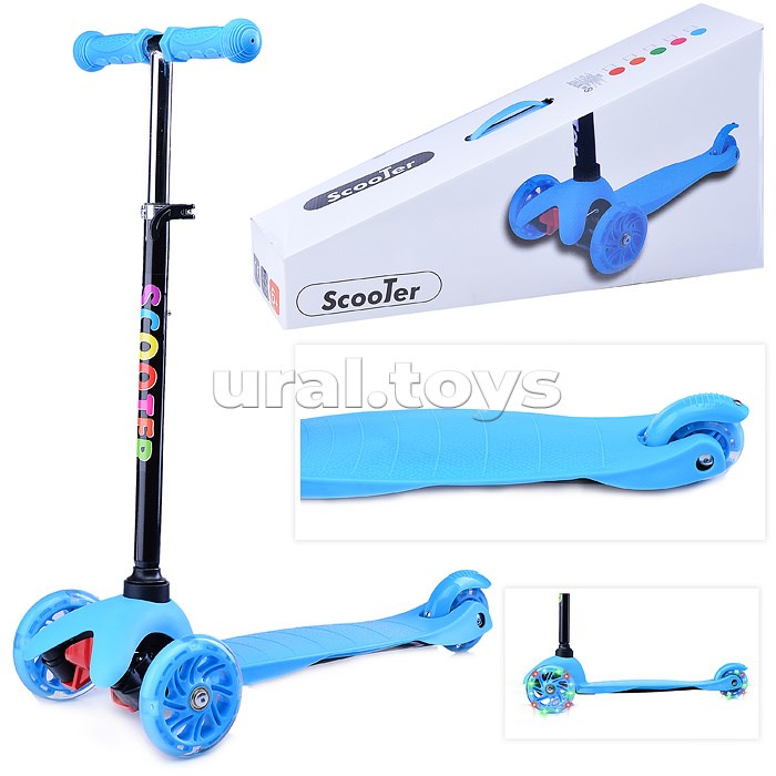 Самокат 3-х кол., синий, светящиеся колёса, PU, ABEC 7, в коробке