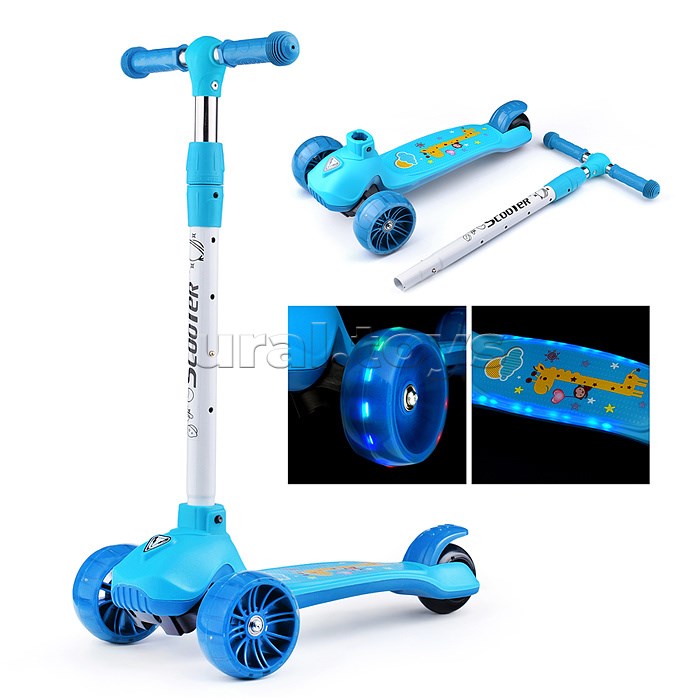 Самокат 3-х кол., синий, светящиеся колёса, PU, ABEC 7, в коробке