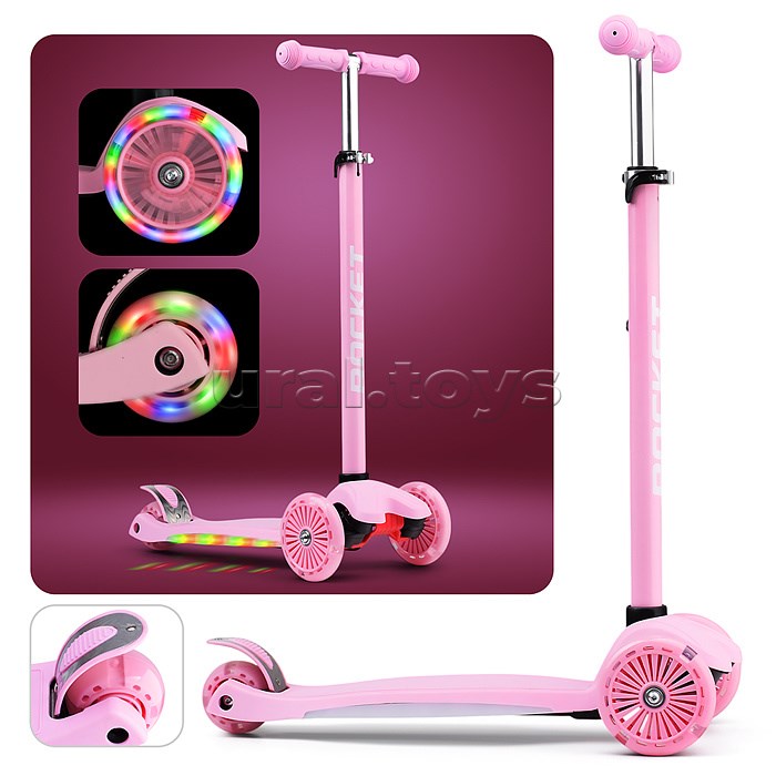 Самокат 3-х колесный ROCKET,колеса PU со светом, ABEC 7, розовый