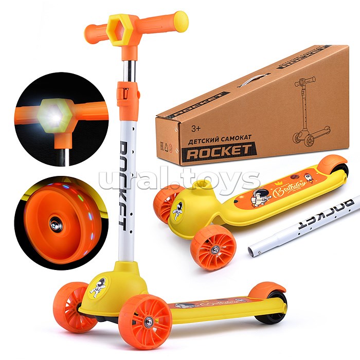 Самокат трёхколёсный ROCKET колёса световые PU, цвет желтый
