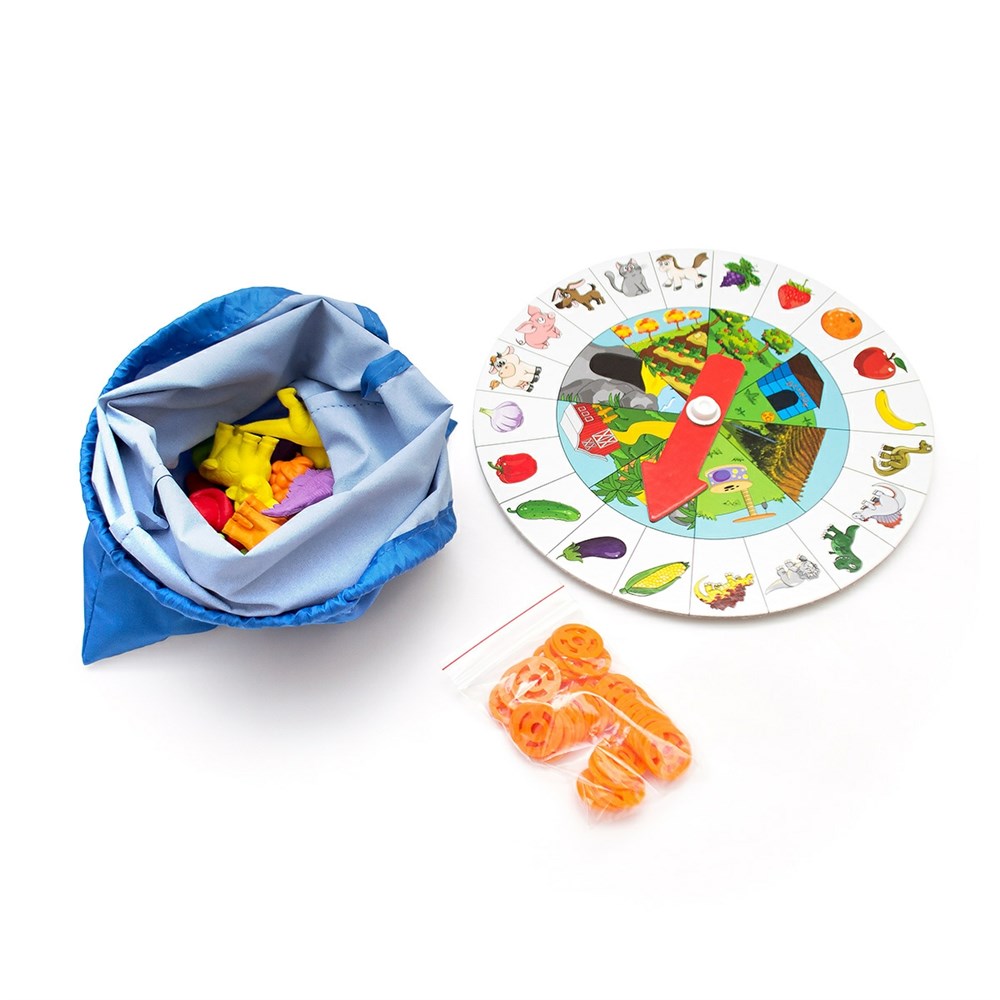Игровое поле со стрелкой, поделенное на сектора; 20 фигурок животных и овощей; Мешок; 44 фишки