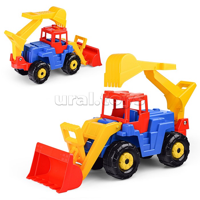Трактор-экскаватор с фронтальным ковшом погрузчиком.