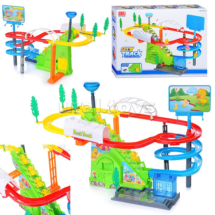 Фигурки курсируют по треку, поднимаясь по эскалатору и скатываясь с горок.